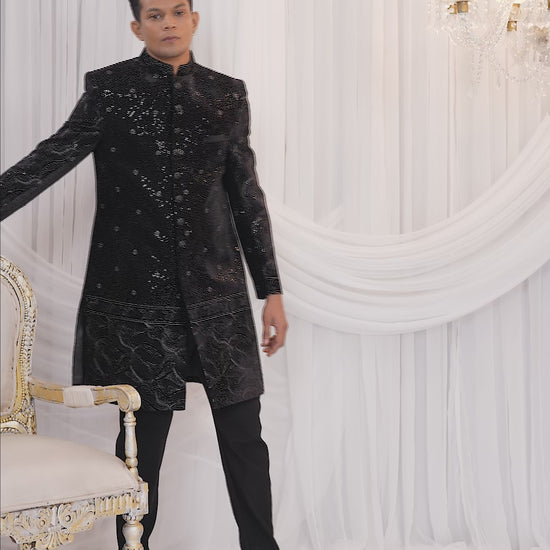 Art Silk Black Wedding Wear Indo Western Sherwani with Computer Thread Work