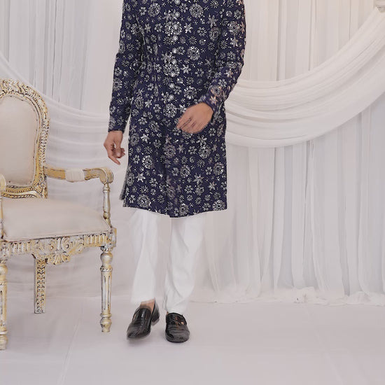 Art Silk Blue Wedding Wear Indo Western Sherwani with Computer Thread Work
