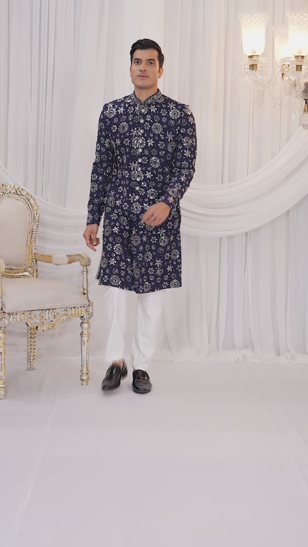 Art Silk Blue Wedding Wear Computer Thread Work Readymade Indo Western Sherwani 386020