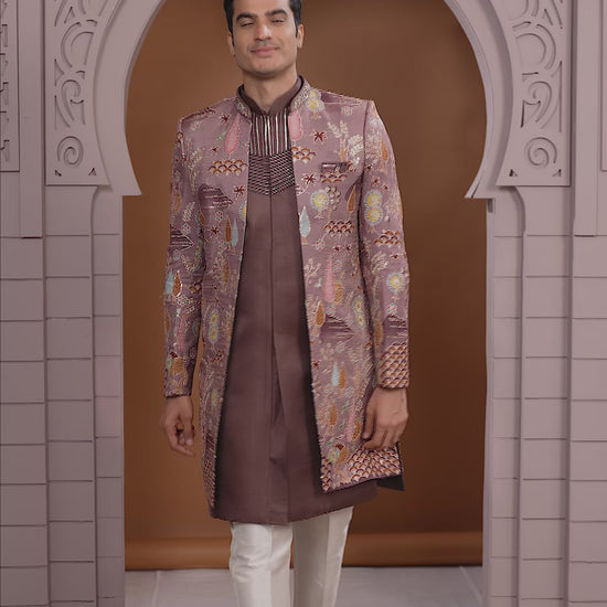 Art Silk Brown Wedding Wear Indo Western Sherwani with Embroidery Work