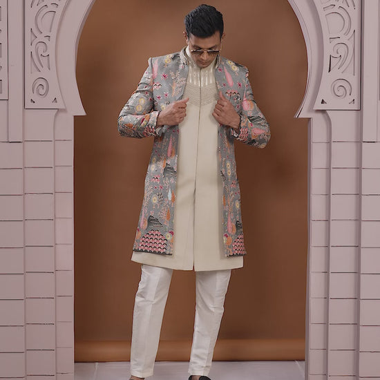 Art Silk Grey Wedding Wear Indo Western Sherwani with Embroidery Work