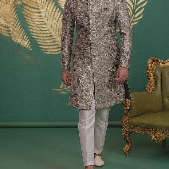Art Silk Grey Wedding Wear Groom Sherwani with Hand Embroidery