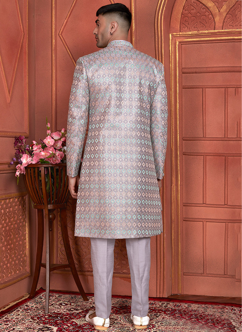 Art Silk Light Purple 2 Pcs Attached Jacket Set adorned with detailed computer thread embroidery, a graceful option for weddings.