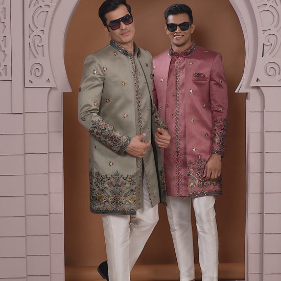 Art Silk Pink Wedding Wear Indo Western Sherwani with Embroidery Work