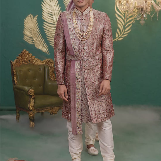 Banarasi Jacquard Maroon Wedding Wear Groom Sherwani with Hand Embroidery