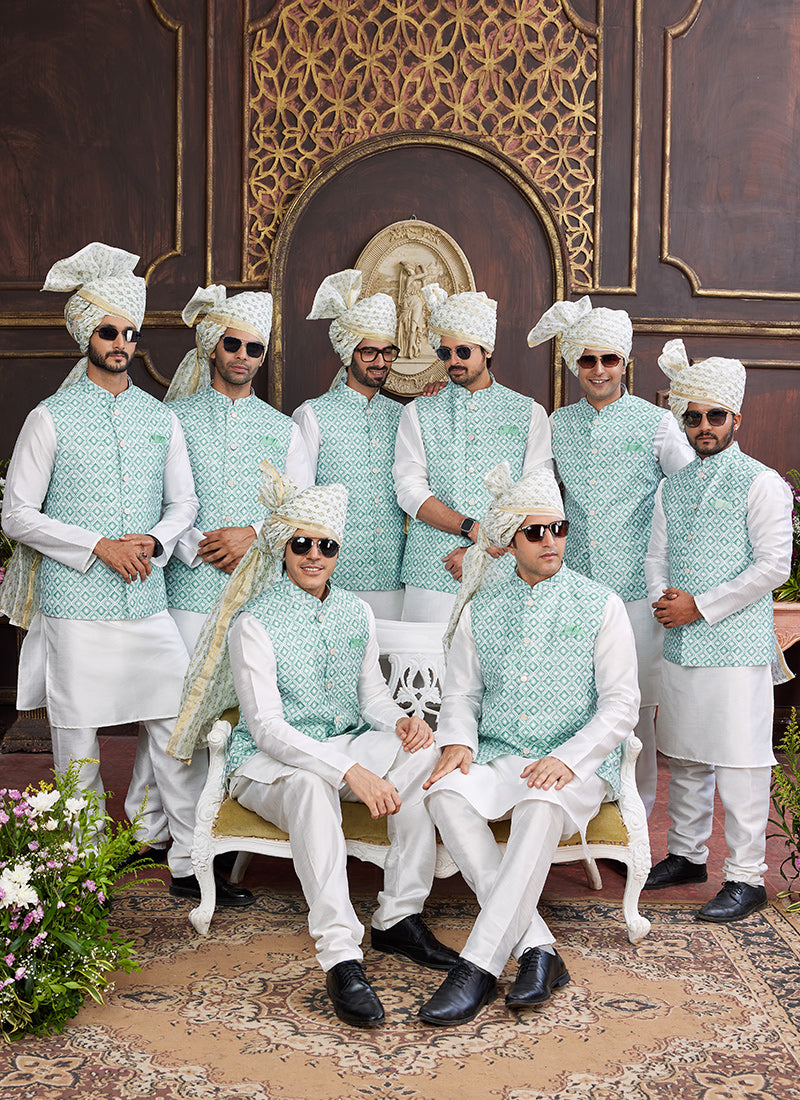 Banarasi Silk Sea Blue Wedding Wear Digital Print Radymade Modi Jacket Kurta Pajama