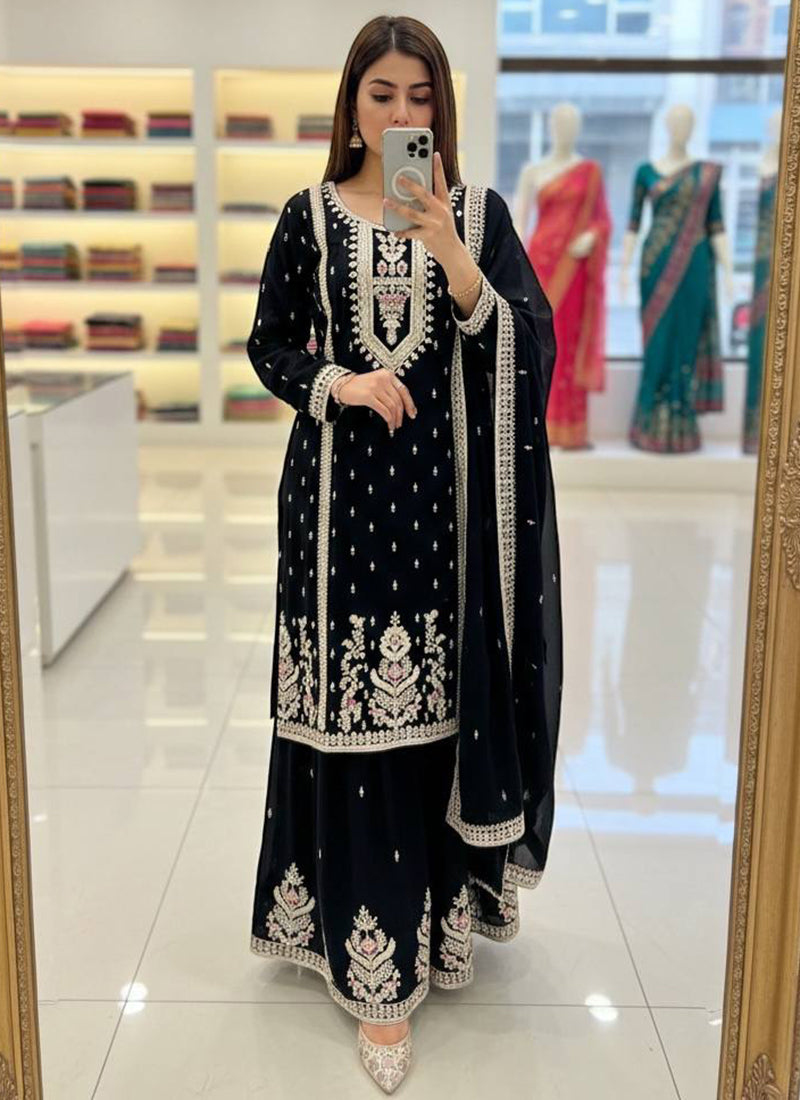 Black Chinon Silk Embroidery Work Festival Wear Readymade Plazzo Suit SW154621