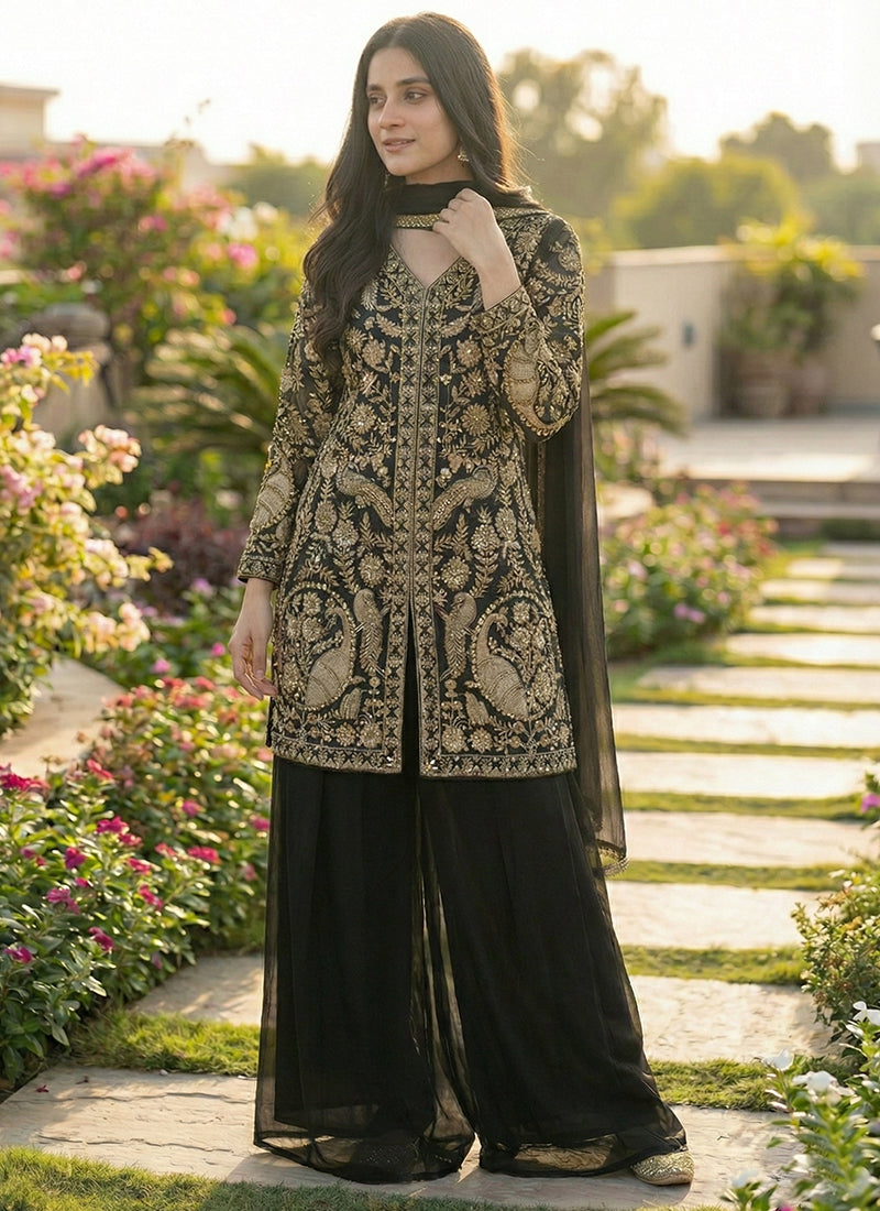 Black Faux Georgette Embroidery Work Party Wear Readymade Plazzo Suit, designed with classic black tones and fine embroidery for a sophisticated party ensemble.