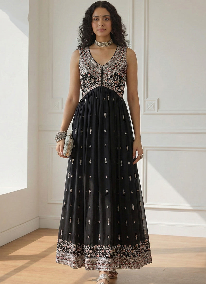 Stunning Black Georgette Festival Wear Readymade Anarkali Suit featuring intricate embroidery work, perfect for festive functions and special occasions.