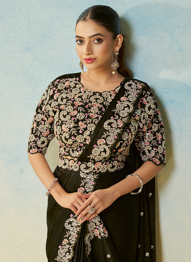 Black Satin Silk Sequin Work Party Wear Ready To Wear Saree, designed in luxurious black satin silk with sparkling sequin details.