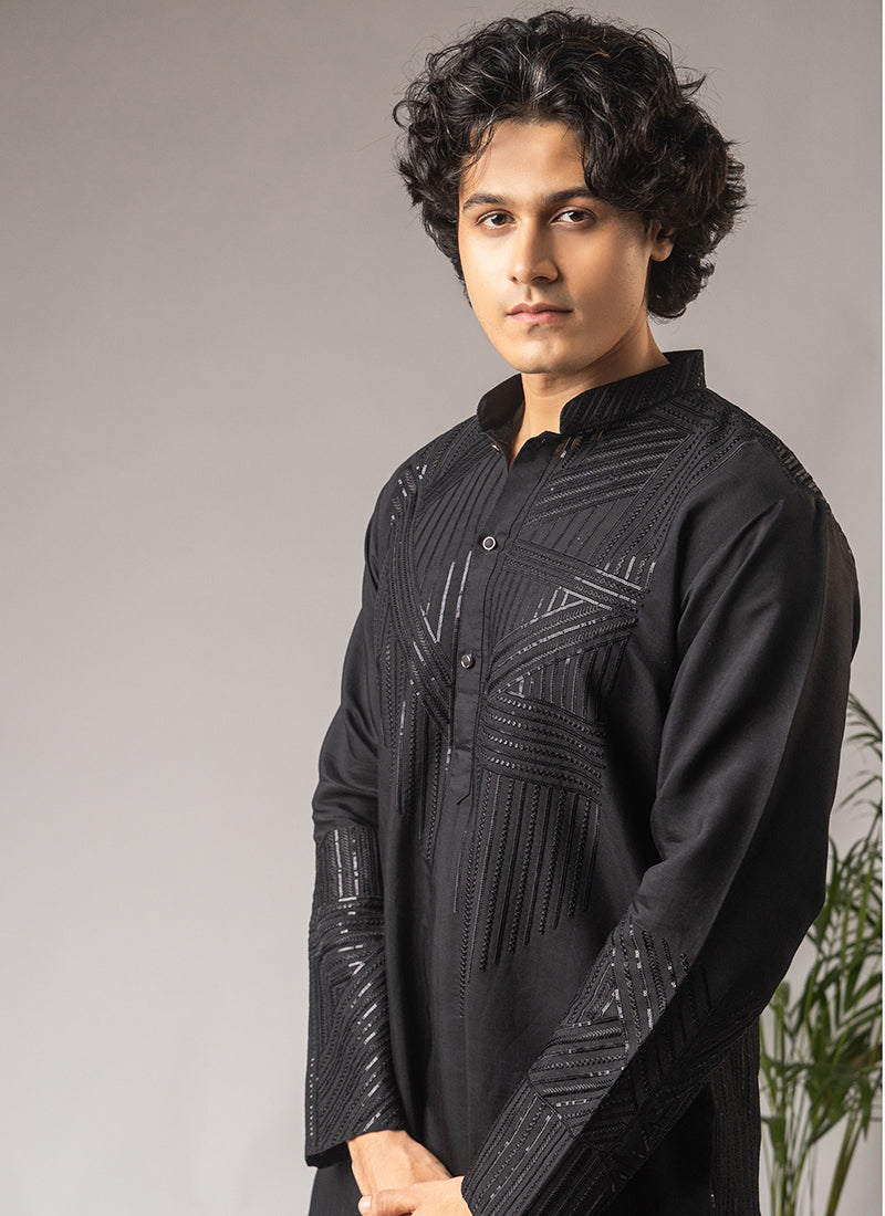 Black Silk Blend Embroidery Work Festival Wear Readymade Kurta Pajama , tailored in rich black silk blend fabric featuring intricate embroidery for a classic festive appearance.