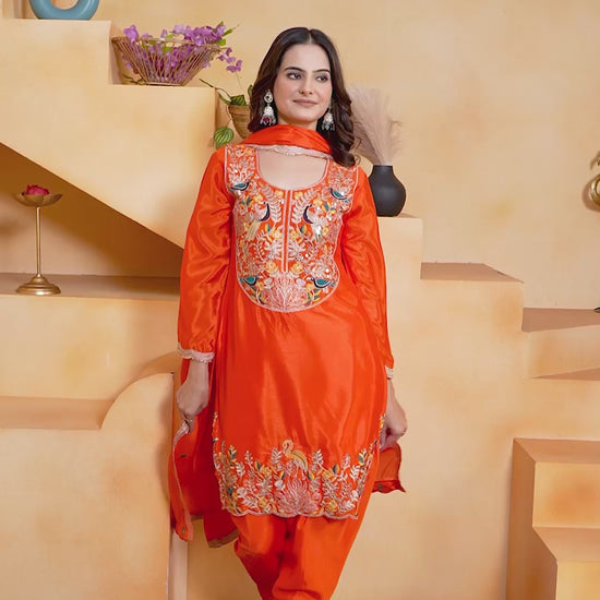 Chinnon Orange Wedding Wear Emroidery Work Readymade Dhoti Suit 384617