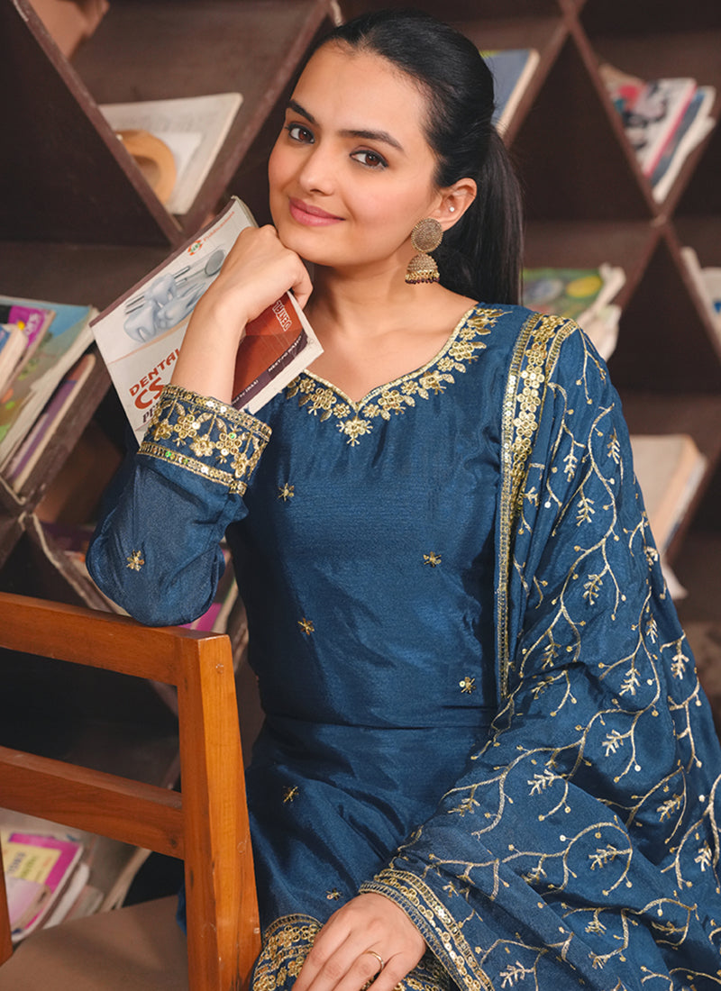 Chinon Navy Blue Party Wear Sequins Embroidery Work Readymade Plazzo Suit 388242