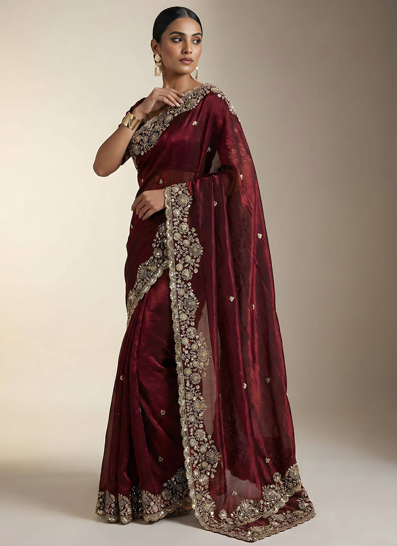 Deep Maroon Fendy Satin Silk Zari Embroidery Work Wedding Wear Wedding Saree, adorned with intricate zari embroidery for a regal and traditional wedding ensemble.