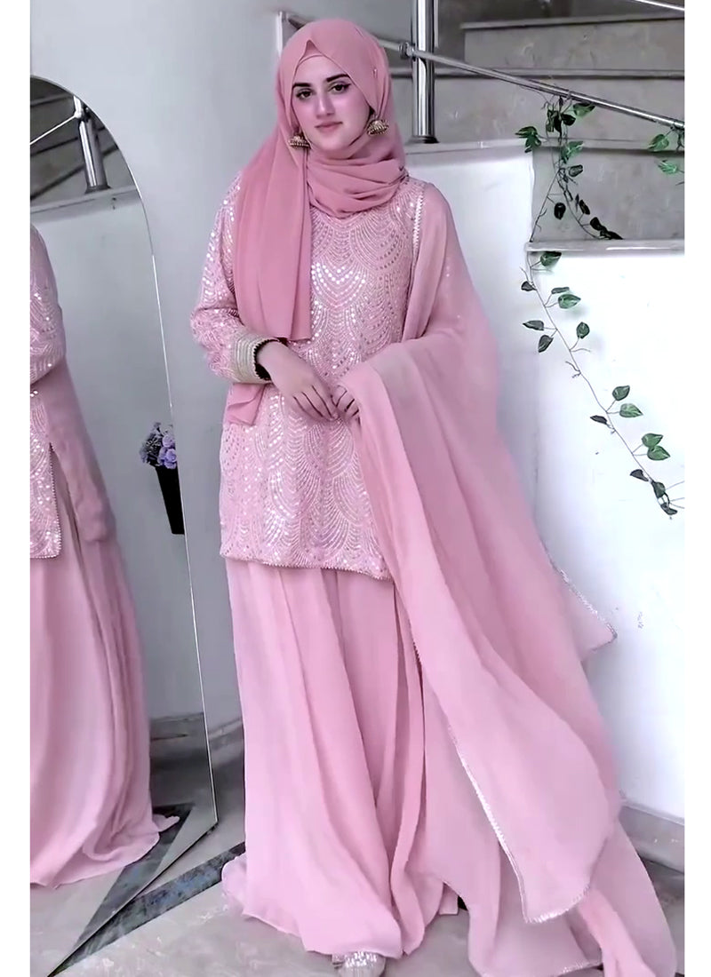 Charming Faux Georgette Light Pink Eid Wear Readymade Plazzo Suit beautifully embellished with delicate embroidery work, perfect for festive Eid celebrations and special occasions.