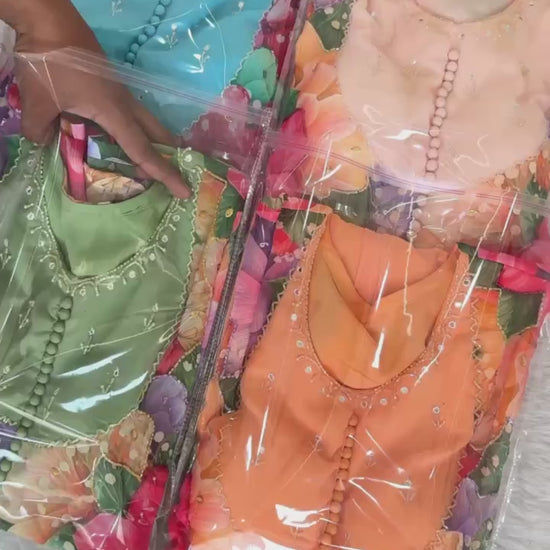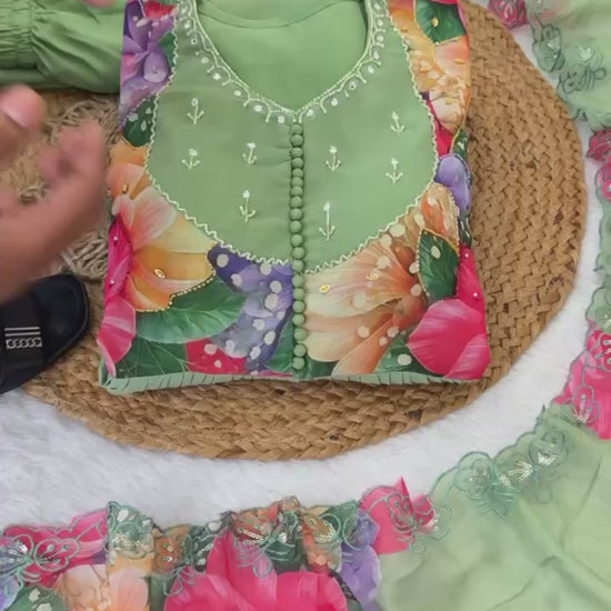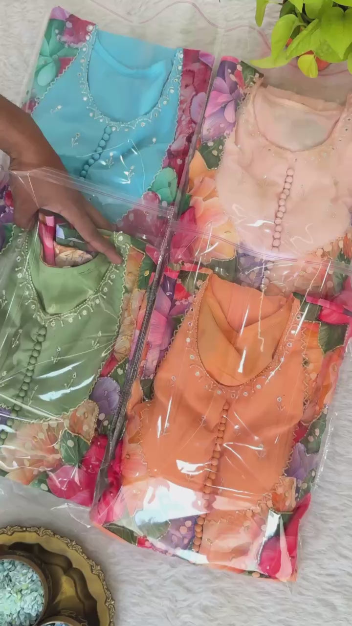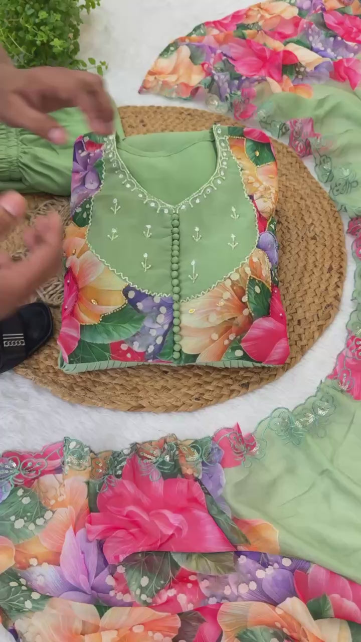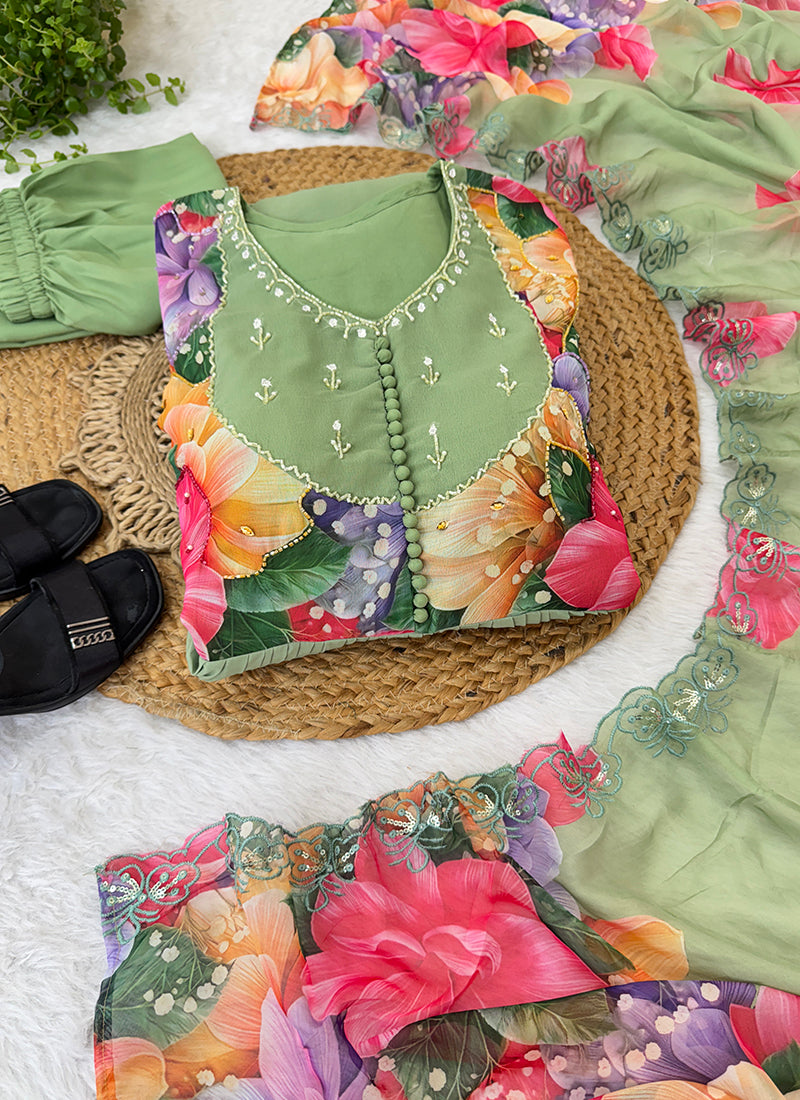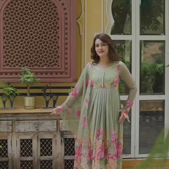 Faux Georgette Pista Readymade Anarkali Suit adorned with elegant Hand Work, perfect for festive wear.