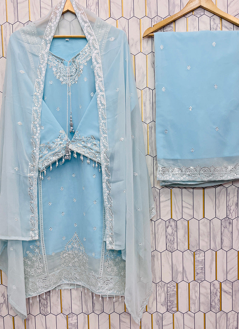 Faux Georgette Sky Blue Eid Wear Embroidery Work Readymade Plazzo Suit 387200
