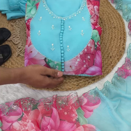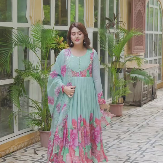 Faux Georgette Sky Blue Festival Wear Digital Print Work Readymade Anarkali Suit 384893