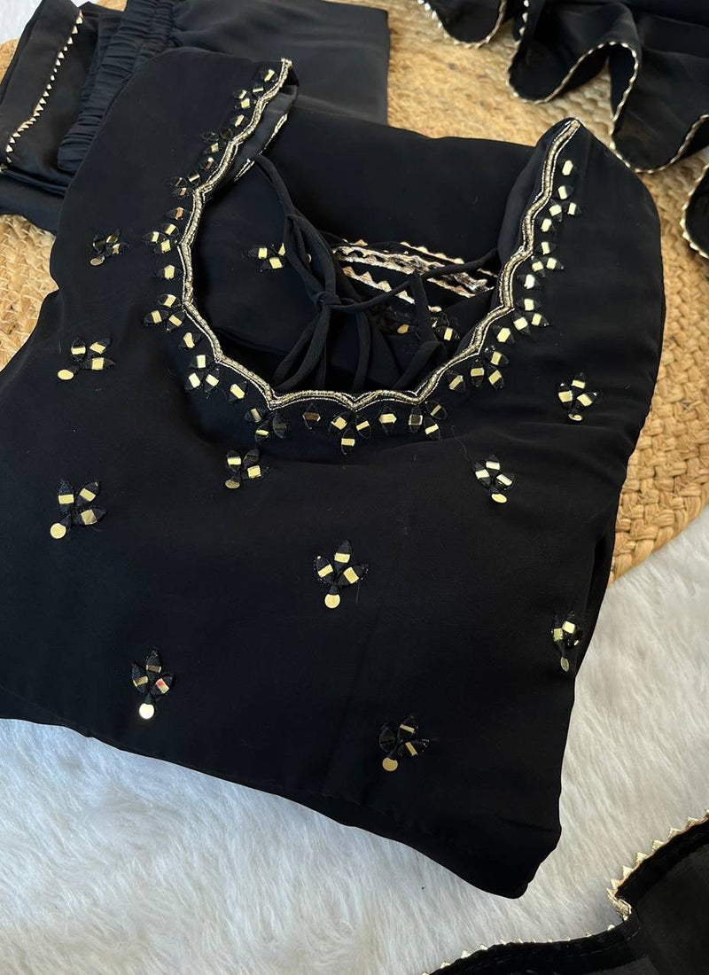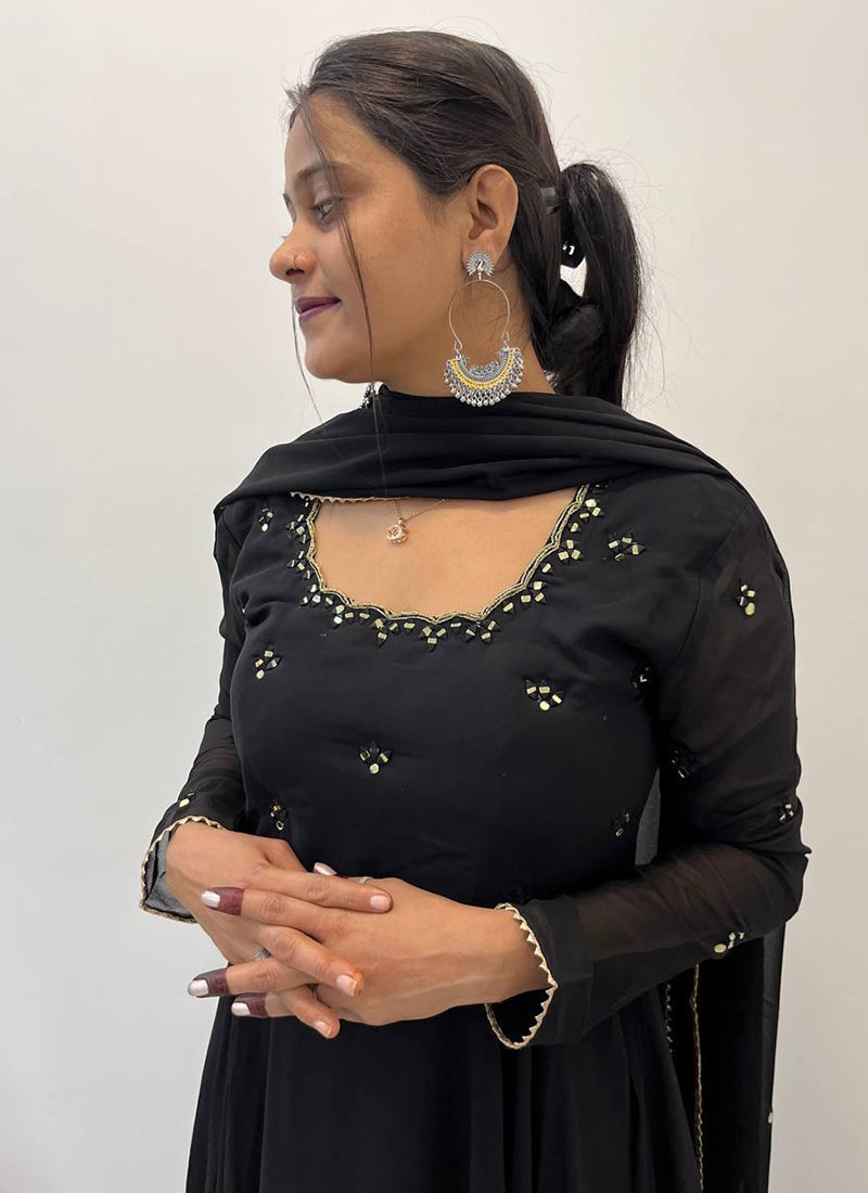 Elegant Georgette Black Party Wear Readymade Gown beautifully embellished with intricate embroidery work, perfect for parties, receptions, and special occasions.
