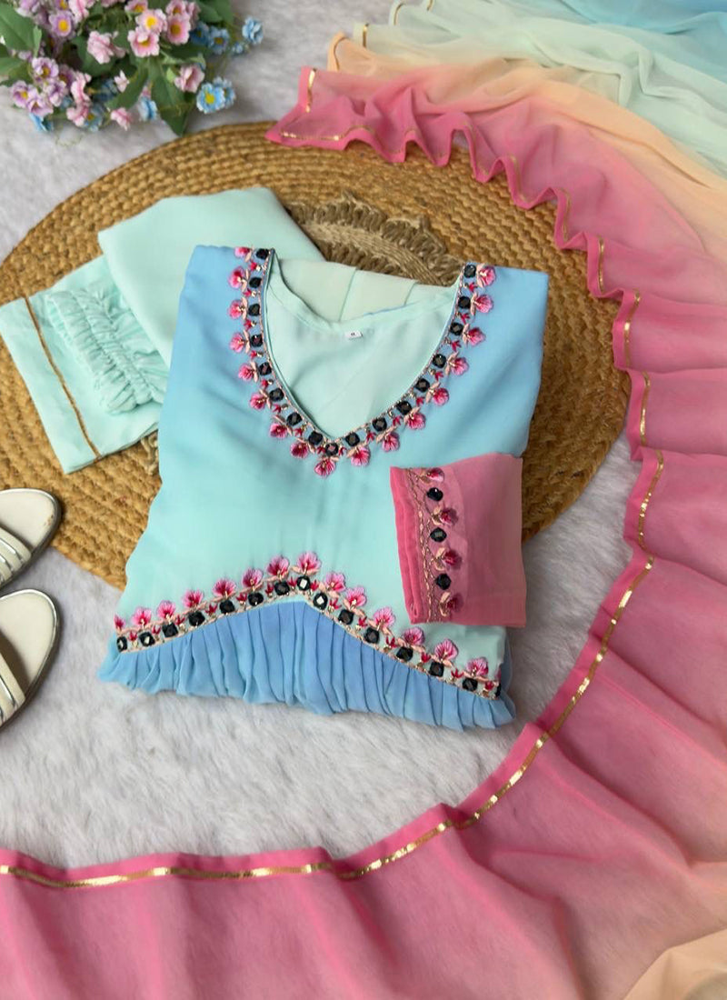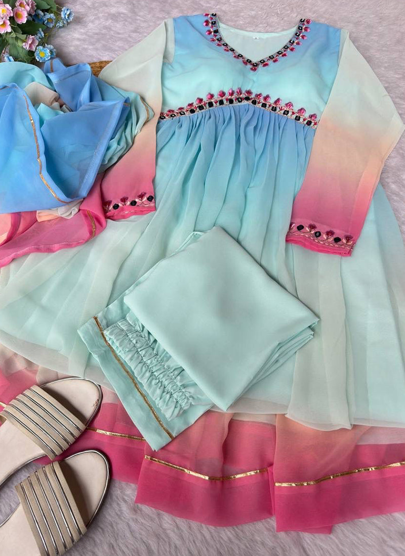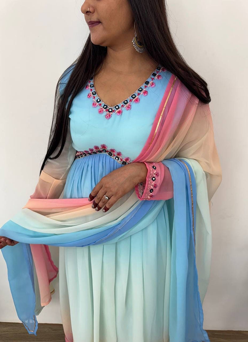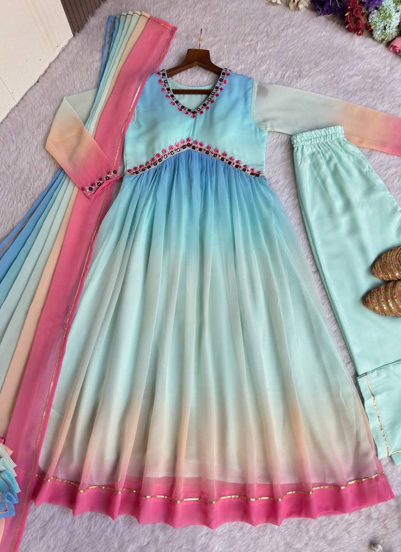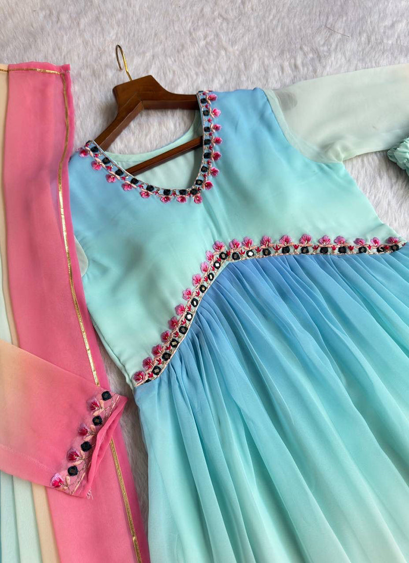Beautiful Georgette Multi Color Party Wear Readymade Gown elegantly adorned with intricate thread work, perfect for parties, functions, and festive occasions.
