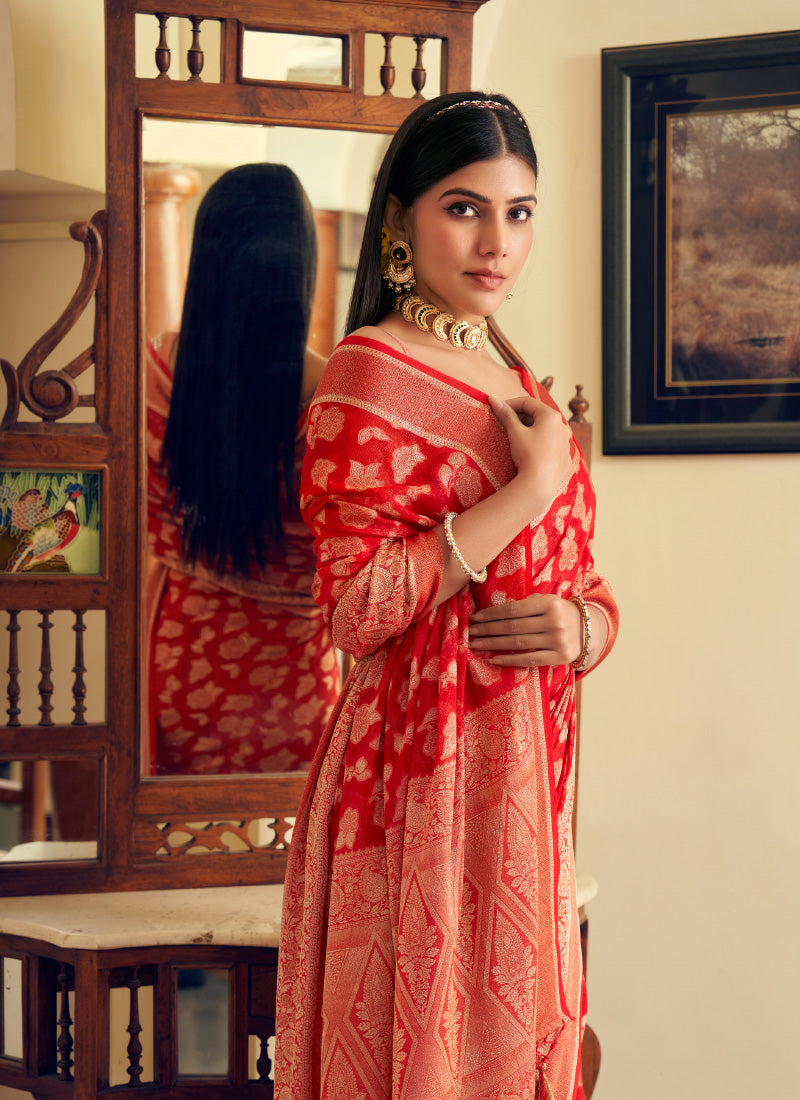 Georgette Red Festival Wear Saree with Traditional Weaving Work