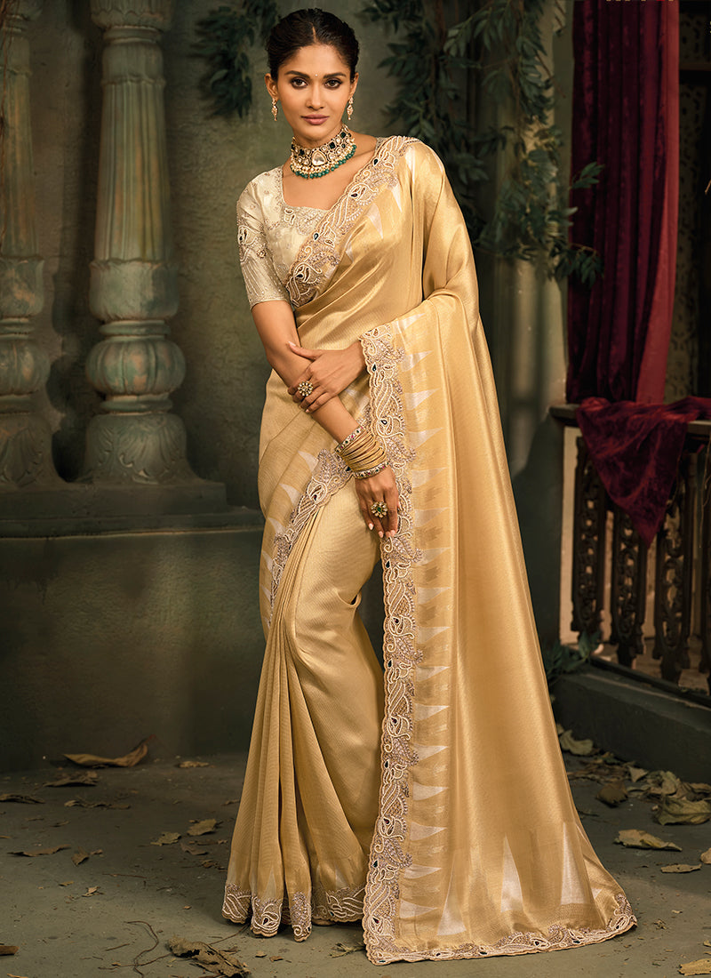 Golden Giraffe Silk Embroidery Work Wedding Wear Wedding Saree, featuring luxurious golden hues and ornate embroidery for a royal wedding look.