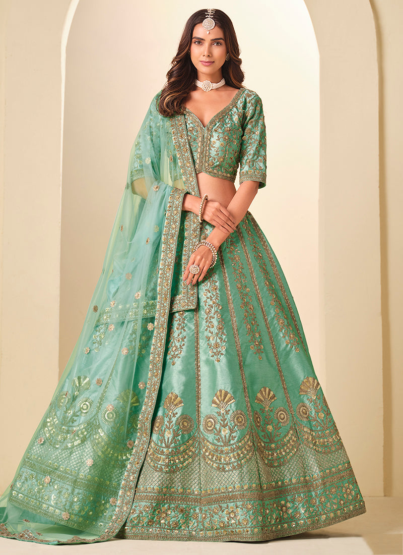 Green Art Silk Embroidery Work Wedding Wear Lehenga Choli SW481032