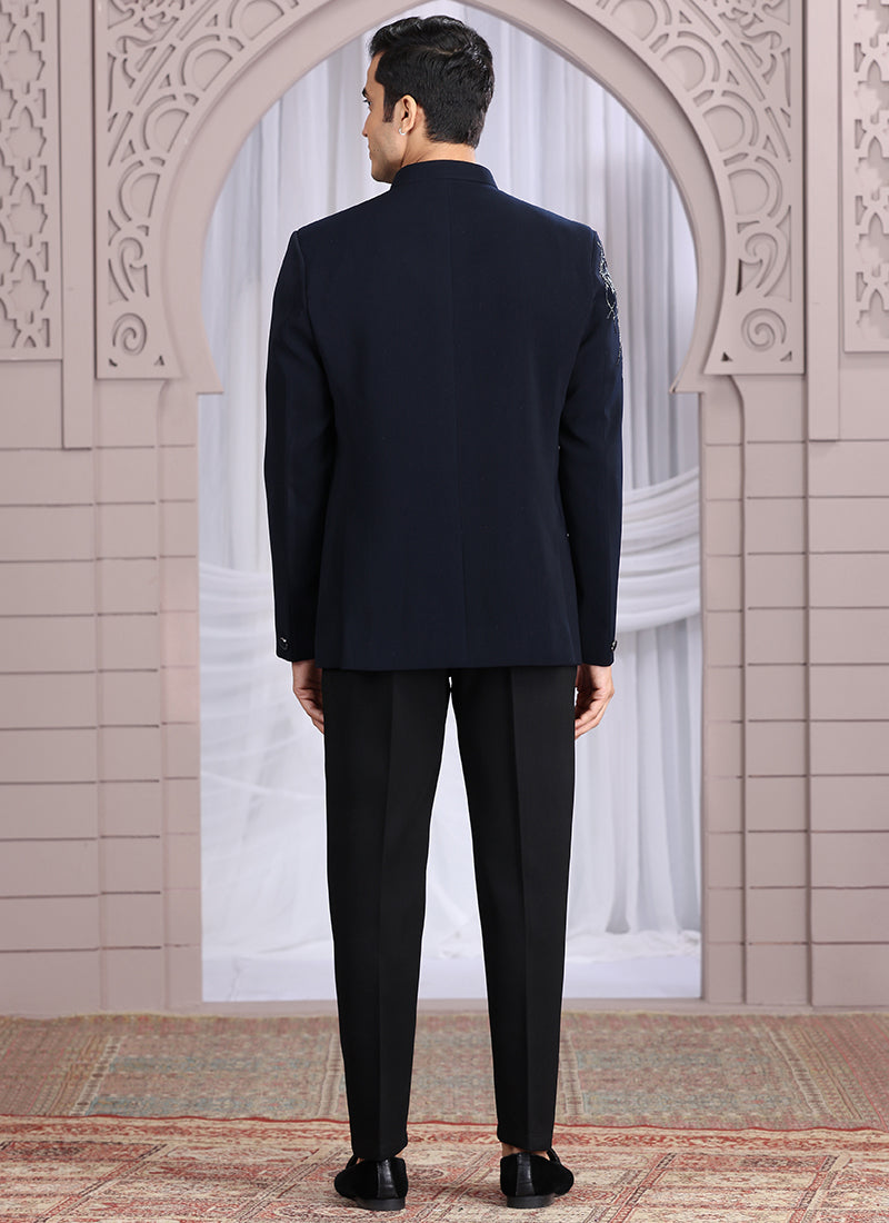 Imported Blue Jodhpuri Suit featuring detailed hand work for wedding occasions.