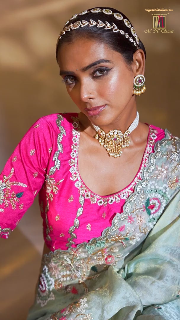This Kanjivaram Silk Green Wedding Wear Embroidery Work Saree captures traditional grandeur. The deep green hue and classic Kanjivaram weave make it a statement piece for weddings.