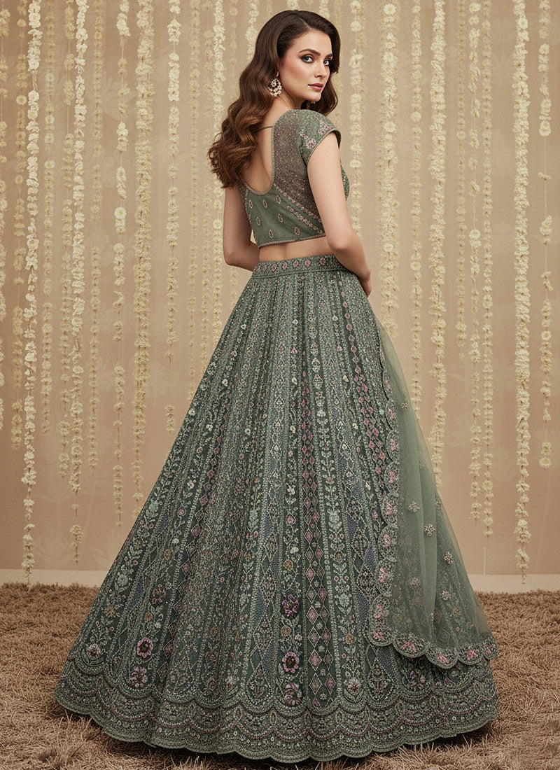 Light Green Net Embroidery Work Bridal Wear Lehenga Choli, designed with refreshing green tones and fine embroidery for a graceful bridal ensemble.