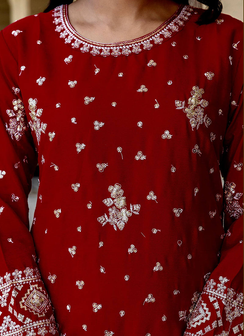 Maroon Chinon Silk Sequins Work Festival Wear Readymade Sharara Suit, crafted with shimmering sequins on rich Chinon silk for a regal and festive look.