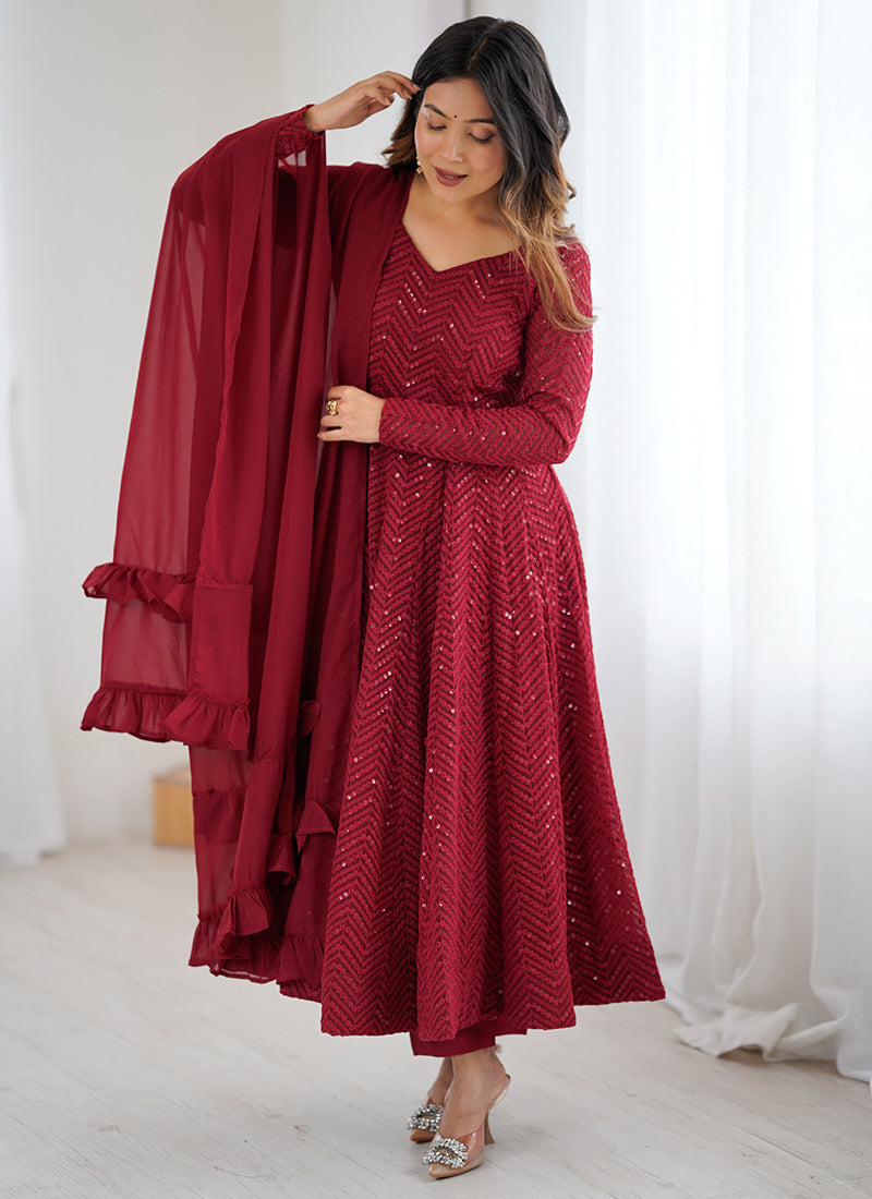 Maroon Faux Georgette Sequin Work Casual Wear Readymade Anarkali Suit, styled with rich maroon hues and subtle sequin work for a classy and comfortable casual look.