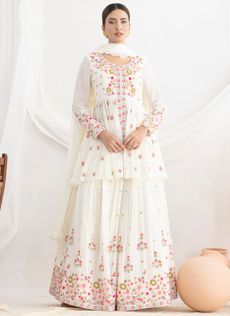 Off White Georgette Beads Work Wedding Wear Readymade Plazzo Suit SW559395