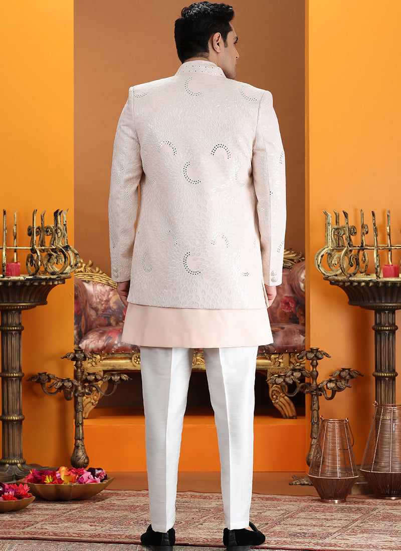 Peach Art Silk Computer Thread Work Wedding Wear Readymade Indowestern Sherwani, highlighted with warm peach tones and intricate thread work for a refined groom outfit.