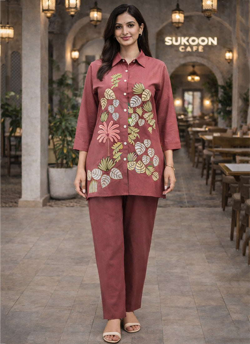 Stunning Peach Cotton Daily Wear Readymade Cord Set featuring elegant thread work, perfect for everyday comfort and casual occasions.
