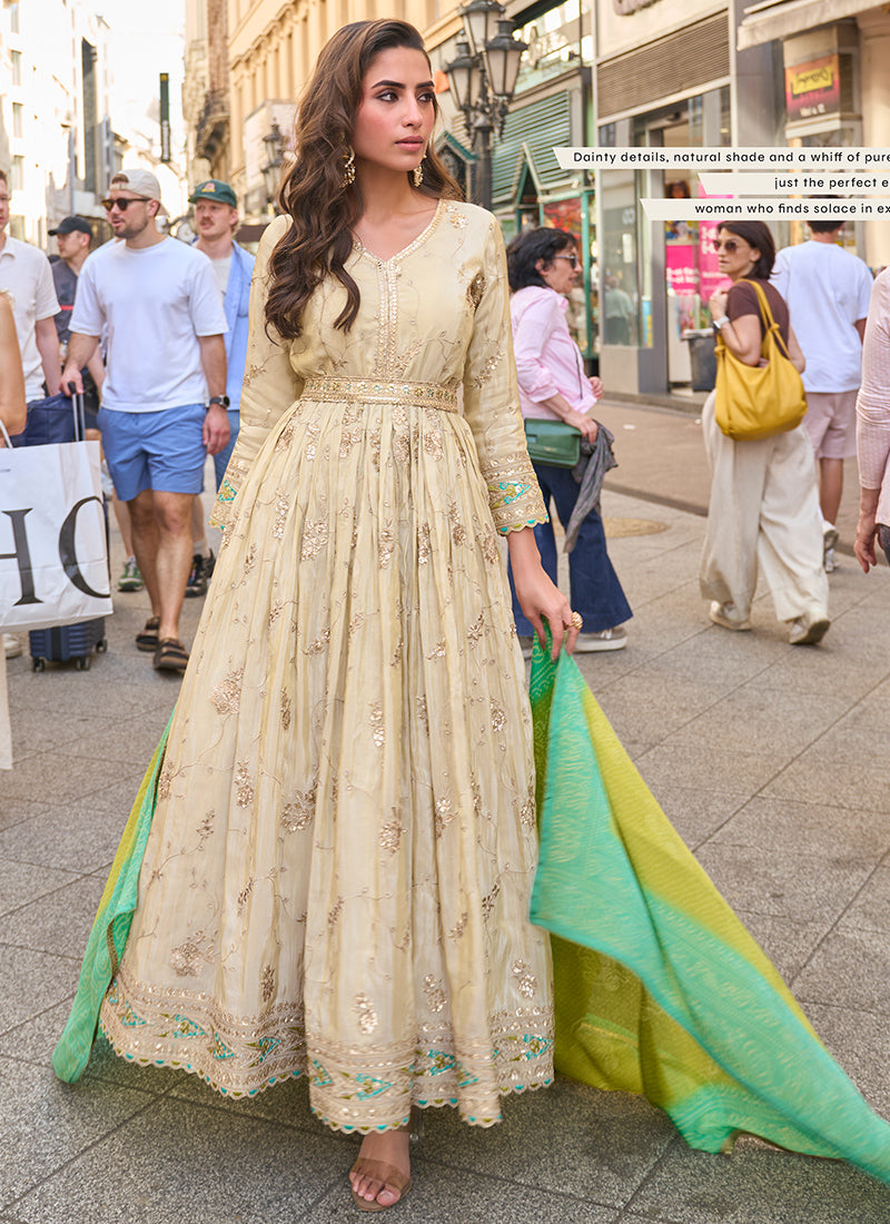 Classic Real Shimmer Silk Cream Festival Wear Embroidery Work Readymade Anarkali Suit adorned with intricate embroidery for a timeless festive charm.