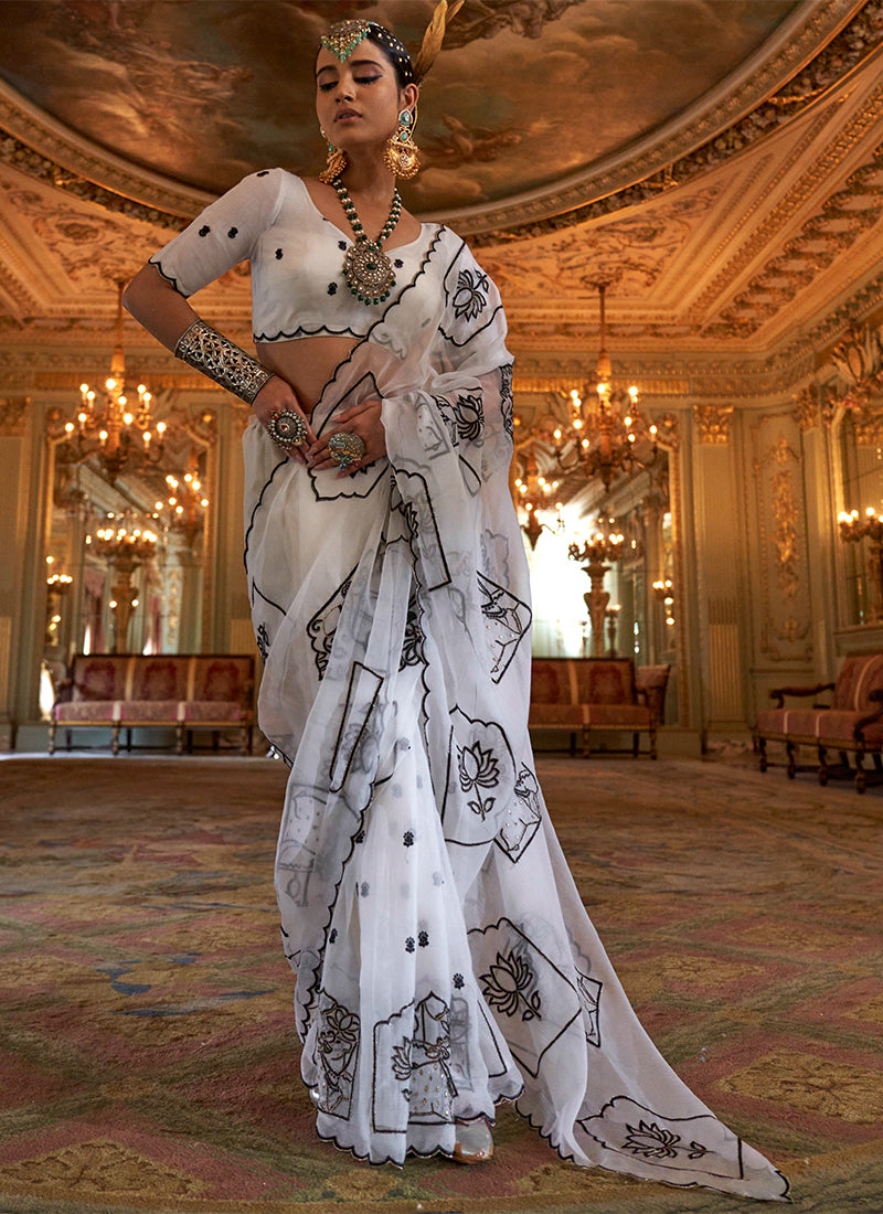 Ruby Chiffon White Festival Wear Thread Embroidery Work Designer Saree showcasing subtle embroidery for timeless festive elegance.