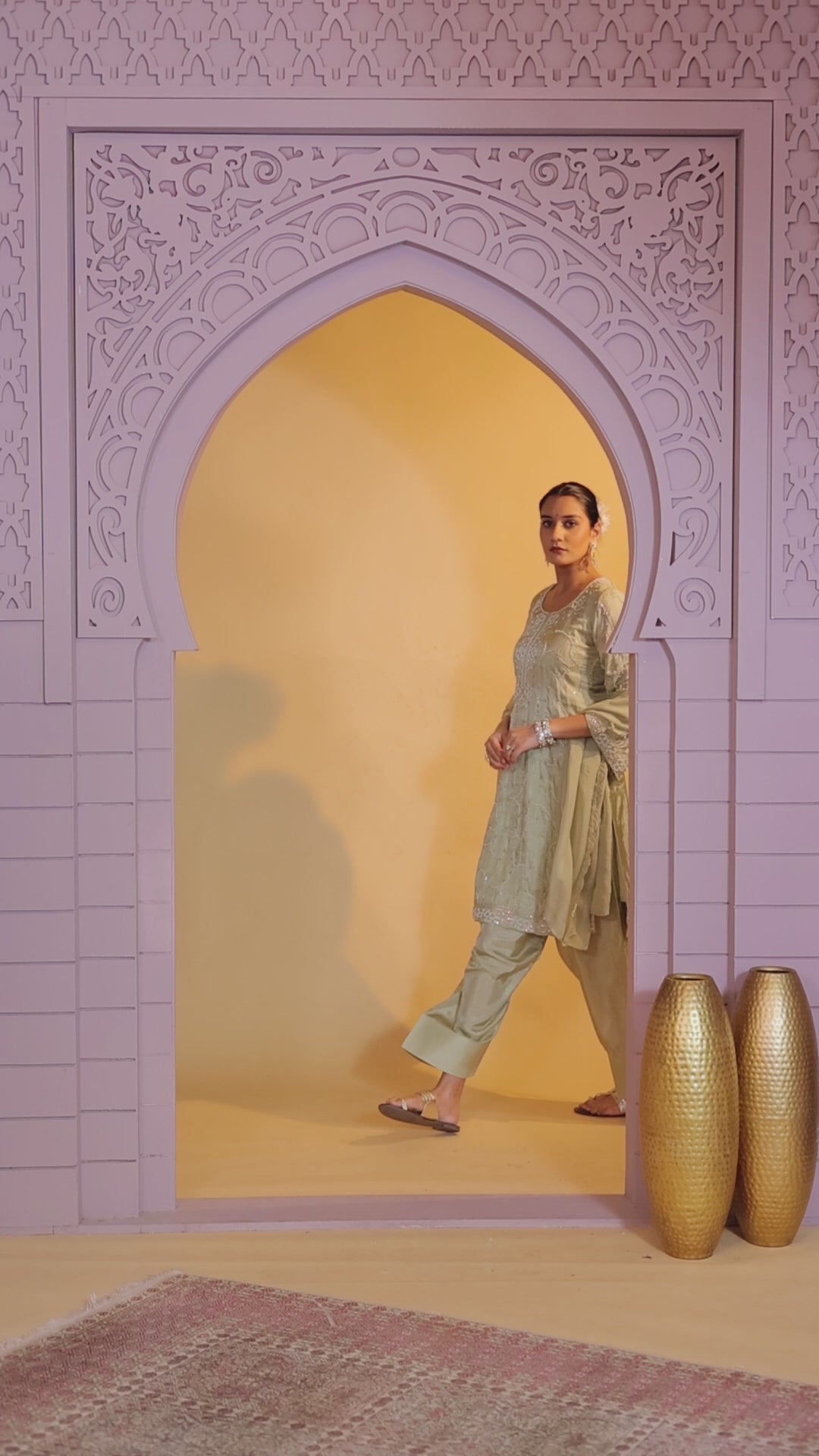 Satin Silk Green Party Wear Readymade Salwar Suit with Pattern Pc Work