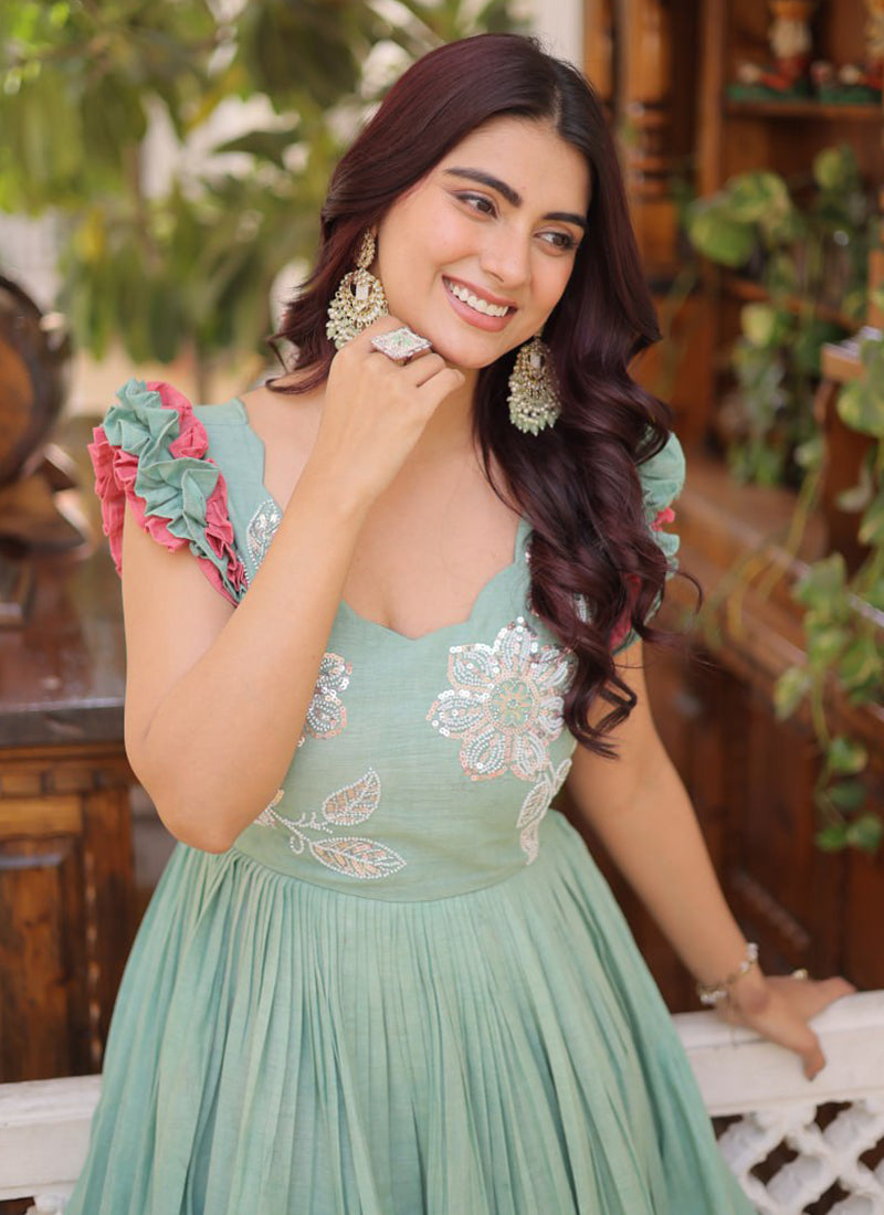 Elevate your party wardrobe with this stunning sky blue cotton gown, expertly crafted for the discerning woman. Adorned with intricate sequin embellishments, this readymade piece combines comfort with sophisticated style, making it ideal for work events, celebrations, and special occasions. The breathable cotton fabric ensures all-day wearability, while the sequin detailing adds a touch of glamour and dimension. Perfect for those seeking a polished, elegant look without compromising on comfort. A versatile investment piece that transitions seamlessly from professional gatherings to festive celebrations.