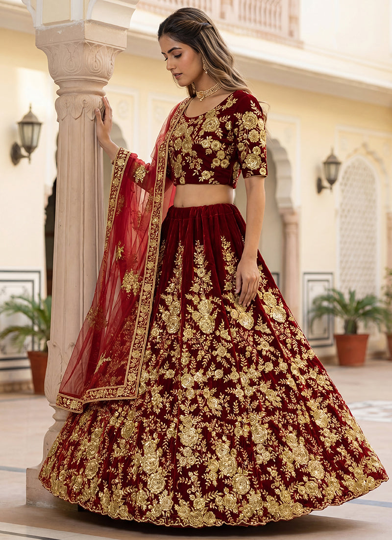 Velvet Maroon Wedding Wear Thread Work Lehenga Choli 390679