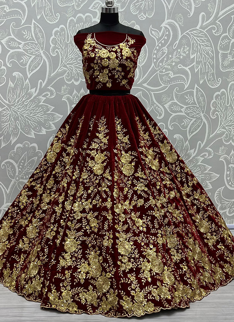 Velvet Maroon Wedding Wear Thread Work Lehenga Choli 390681