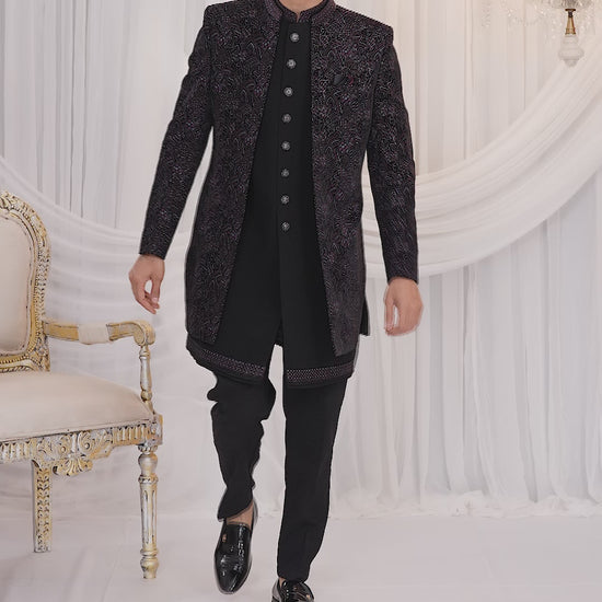 Velvet Silk Black Wedding Wear Indo Western Sherwani with Computer Thread Work