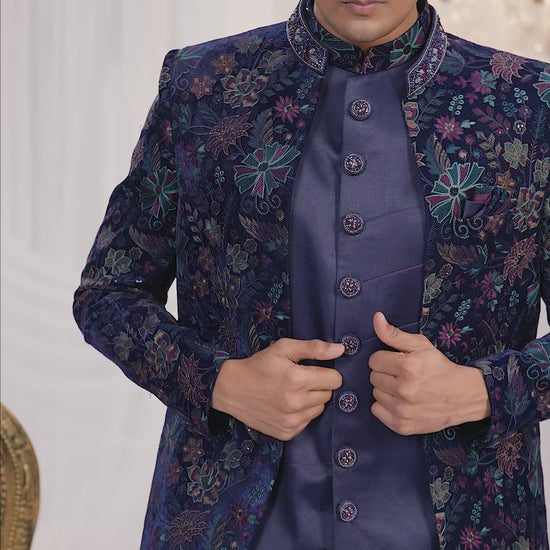 Velvet Silk Navy Blue Wedding Wear Indo Western Sherwani with Computer Thread Work