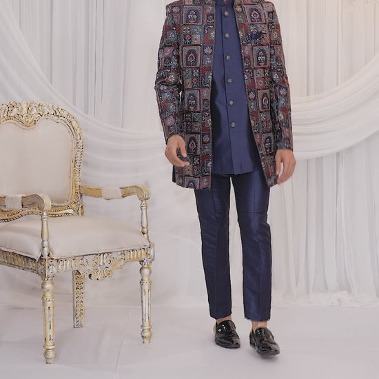 Velvet Silk Navy Blue Wedding Wear Indo Western Sherwani with Computer Thread Work