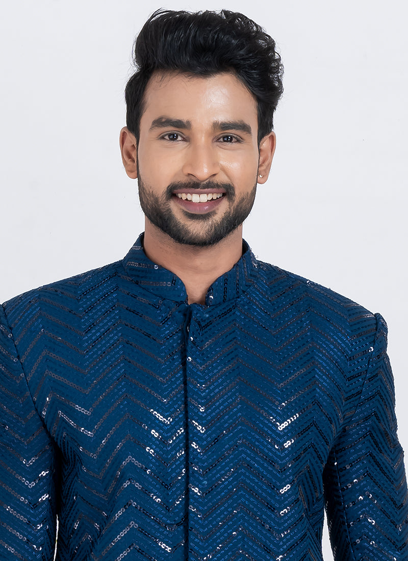 Viscose Rayon Teal Blue Indo Western decorated with sequins work, perfect for festive Eid gatherings.