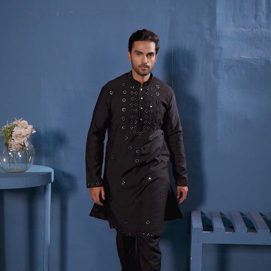 Black Viscose Silk Kurta Pajama designed with rich mirror work, perfect for graceful Festive wear events.