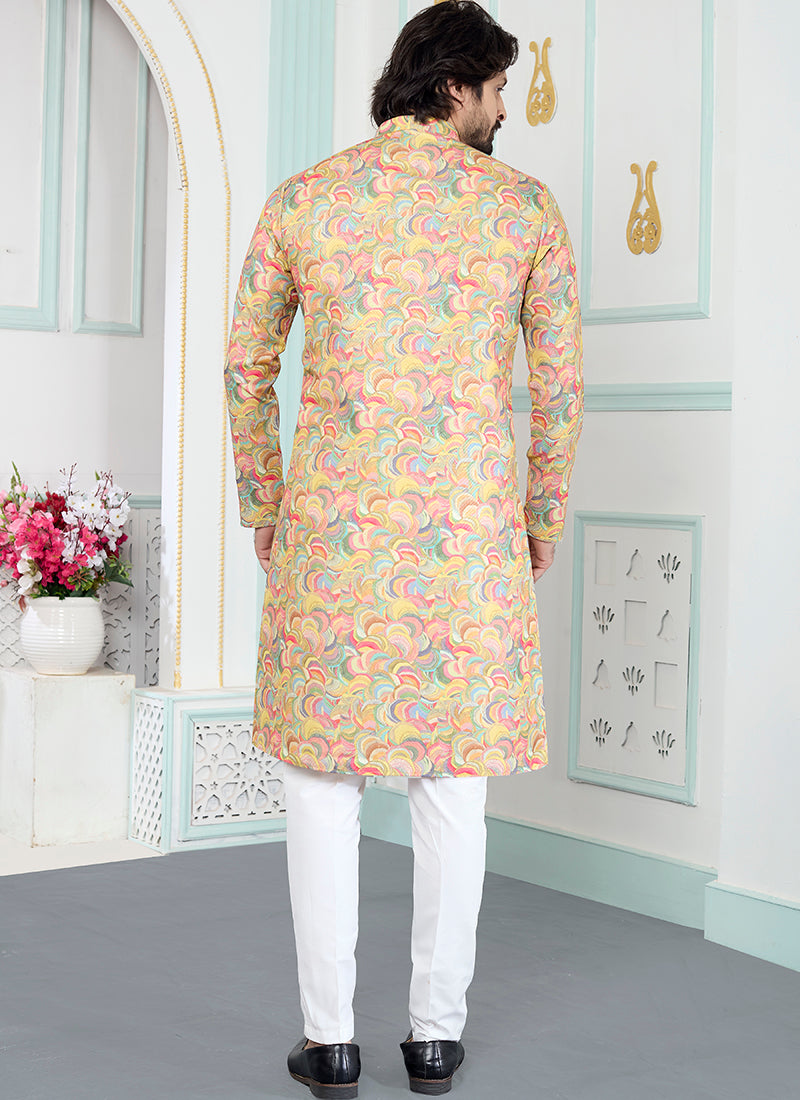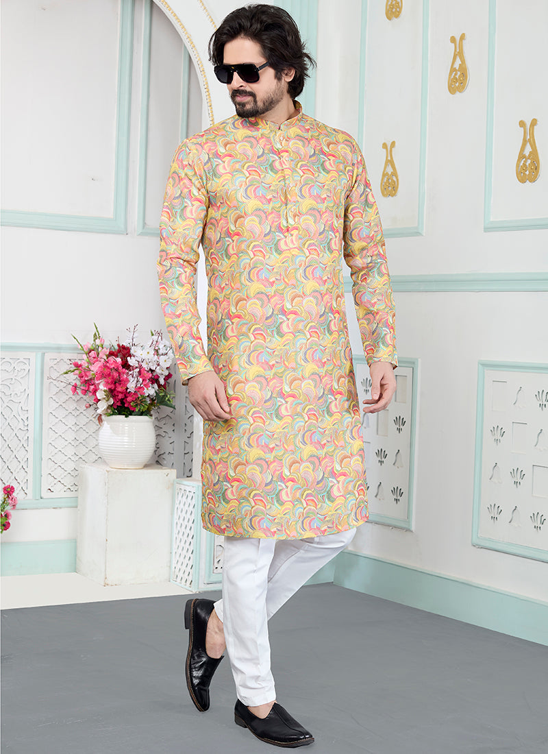 Yellow Art Silk Pattern Pcs Festival Wear Readymade Kurta Pajama, styled in bright yellow art silk with elegant patterns for a cheerful festive look.